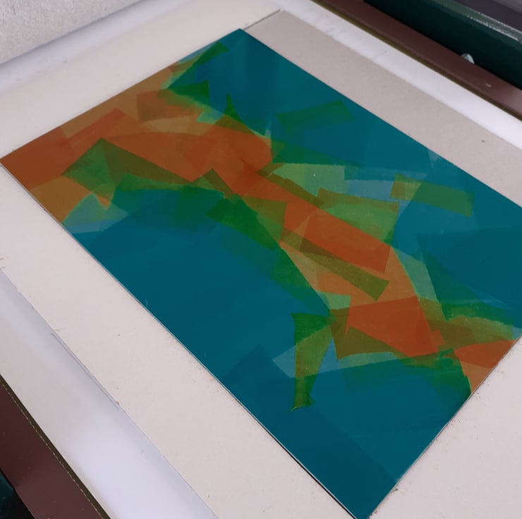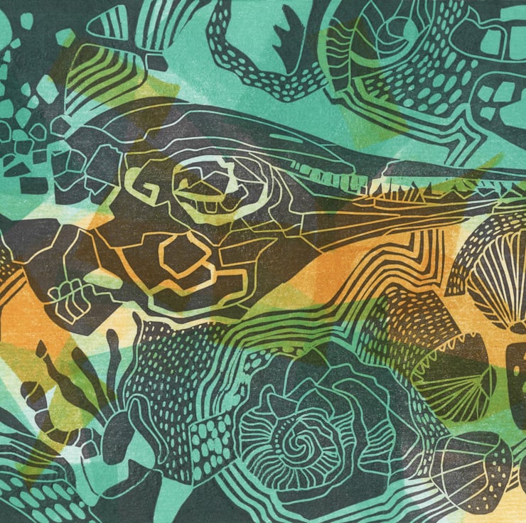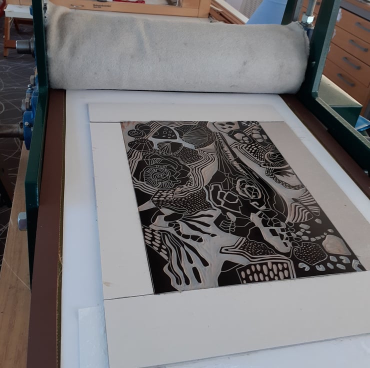 This lino cut is made by printing two blocks together. The first block is rolled up as a mono-print, using small rollers in a random pattern of ochre & turquoise, to suggest the underlying rocks. The key block with the main design, is then printed in indigo, over the top I have included two additional photos to show the process.