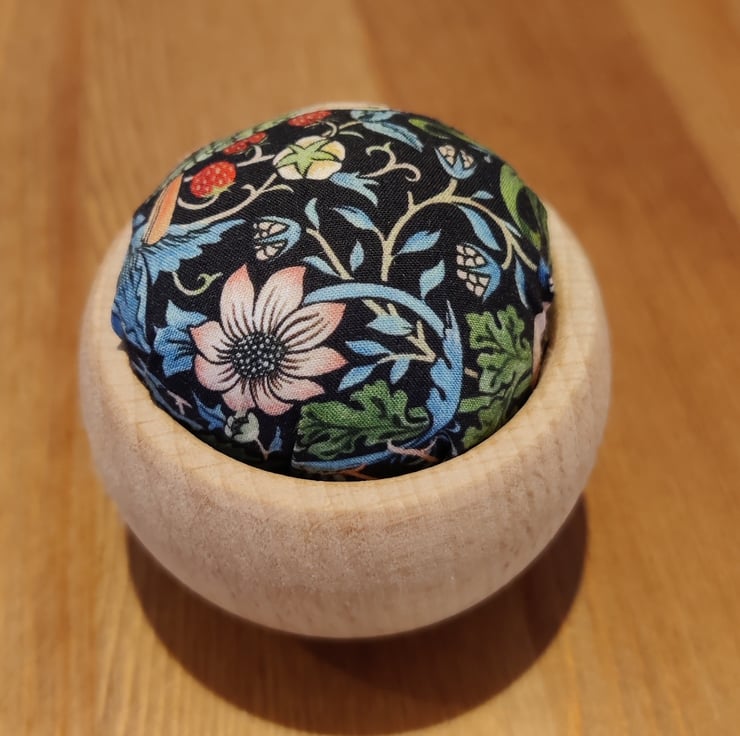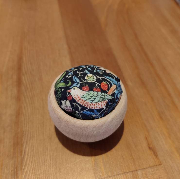 Lovely pincushion made with William Morris fabric the strawberry thief. The wooden base is 5.5 cm diameter and 4 cm tall.