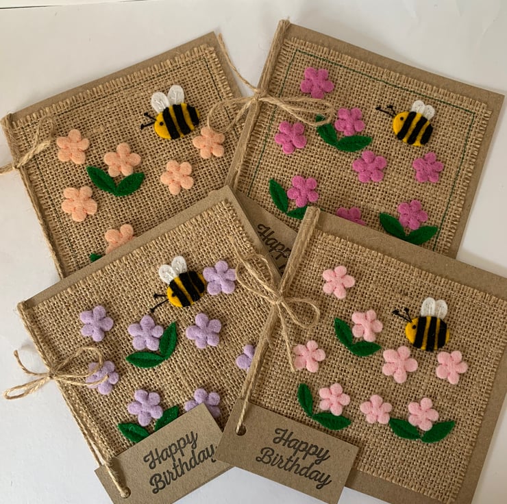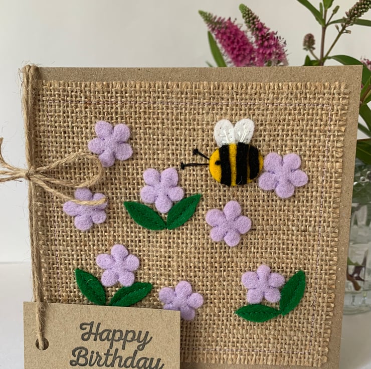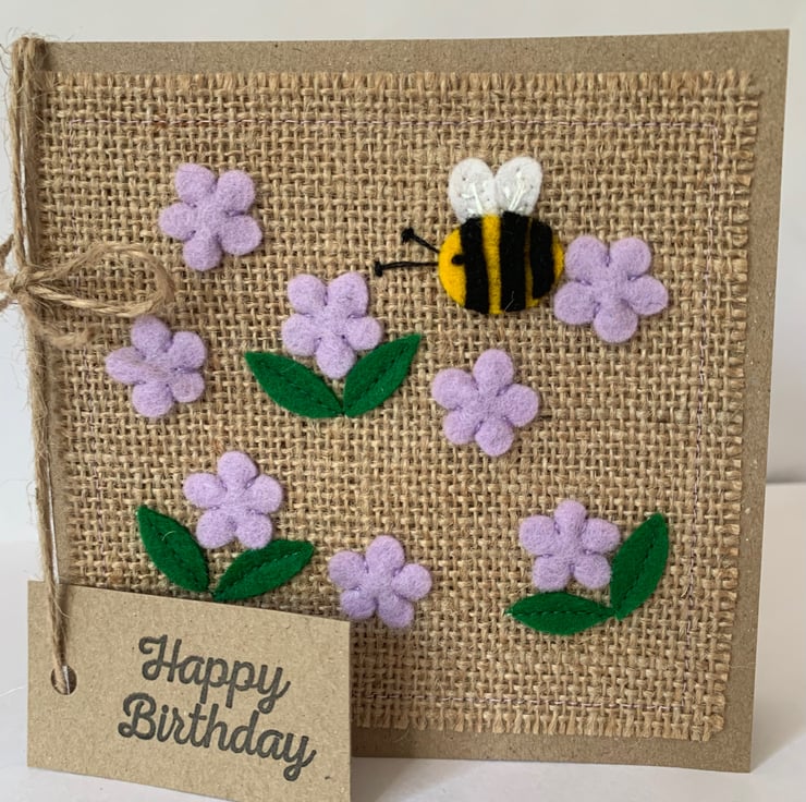 This pretty handmade birthday card is decorated with pale lilac flowers and a bee. The decoration is hand cut from 100%wool felt. It is then sewn by hand and machine onto a hessian background.