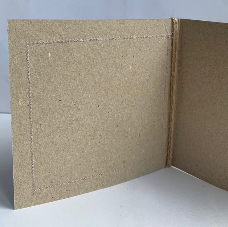 The hessian is machine stitched, using a contrasting thread, onto a plain brown recycled card. This stitching is visible on the inside of the card.