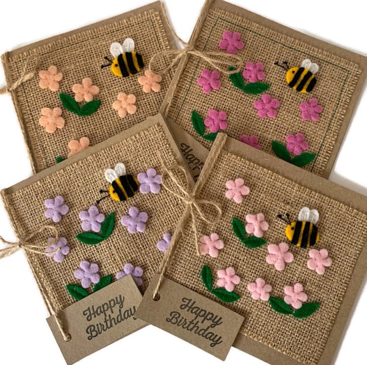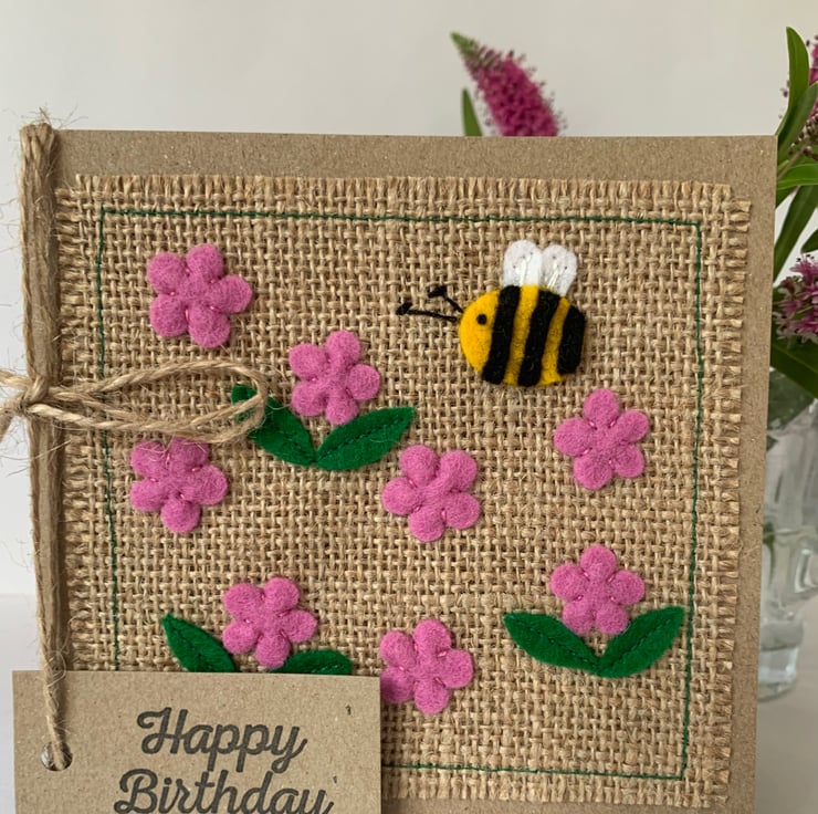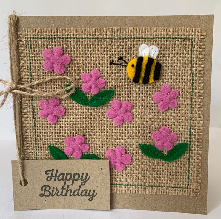 This special birthday card is decorated with delicate rose pink flowers and a bee. The decoration is hand cut from 100%wool felt. It is then sewn by hand and machine onto a hessian background.