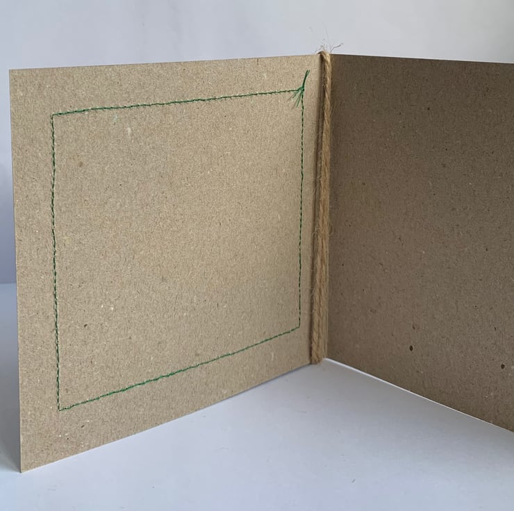 The hessian is machine stitched, using a contrasting thread, onto a plain brown recycled card. This stitching is visible on the inside of the card.