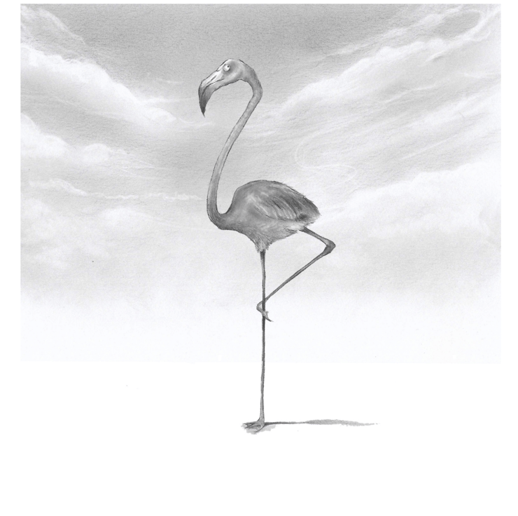 Flamingo and Penguin art drawn with graphite pencil and graphite powder.