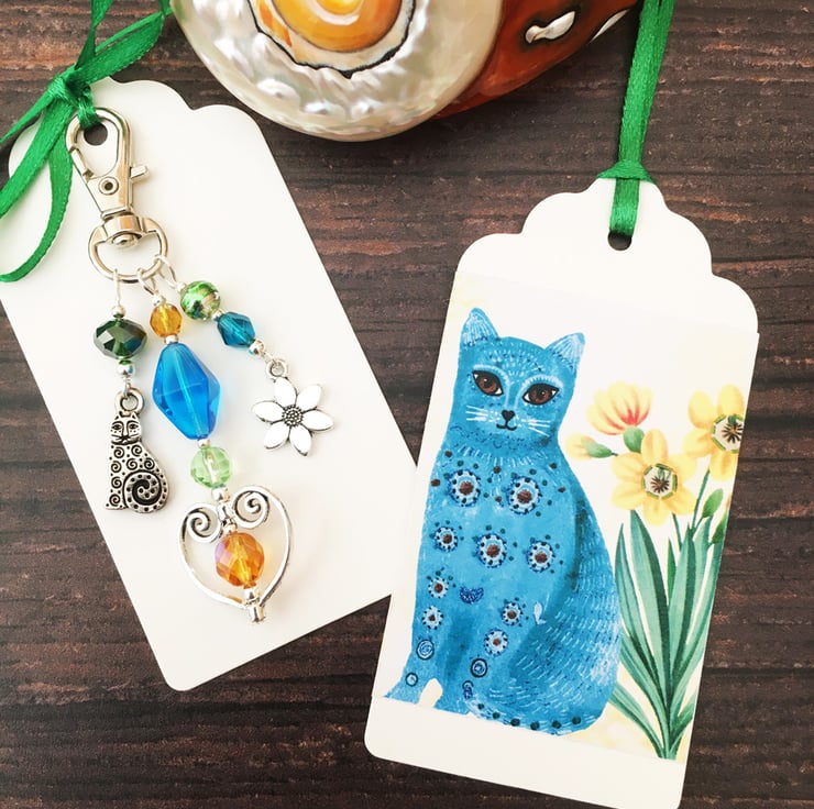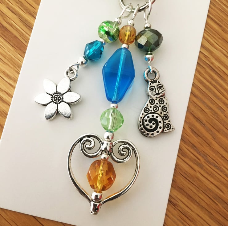 This pretty bag charm would make a lovely little gift for a cat lover. The charm has a silver tone TierraCast spiral cat charm, silver tone heart and flower. I've used a mix of glass beads including Czech fire-polished, crackle glass and drawbench. There is a matching tag with a colourful cat among the flowers.