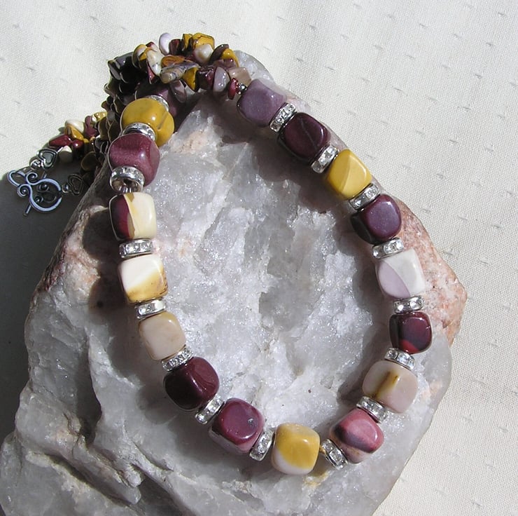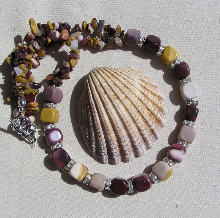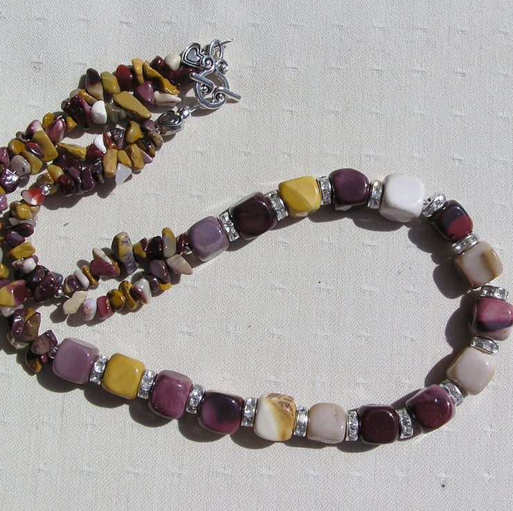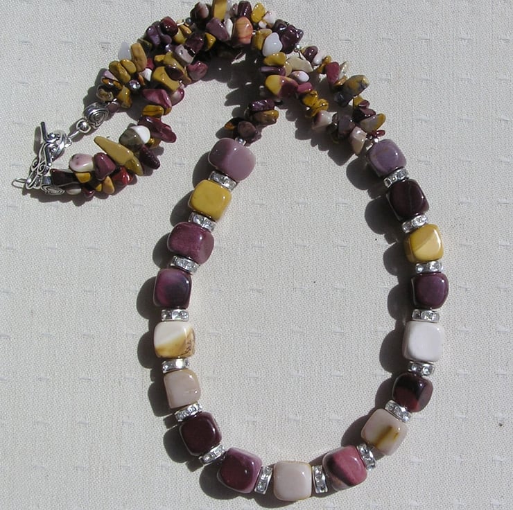 This Stunning Necklace is made wholly from Mookaite Jasper - Chunky Square Beads alternated with Glistening Crystal studded spacers which then flow into double-stranded Mookaite Jasper Gem chips - a Gorgeous warm mix that will look stunning either worn casually or with something more Elegant for a Special Evening out