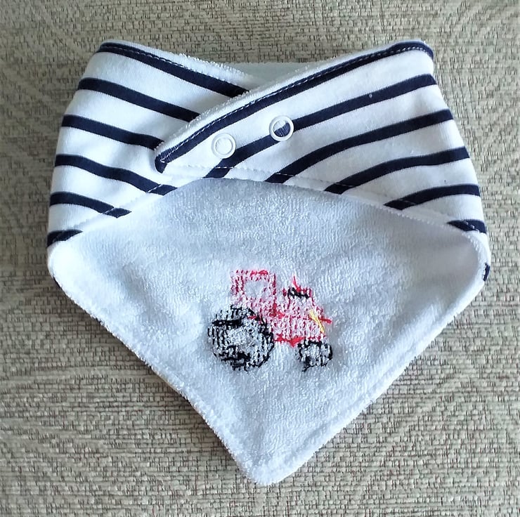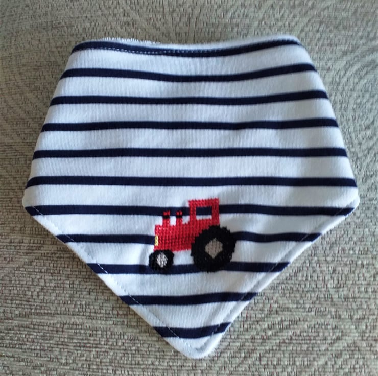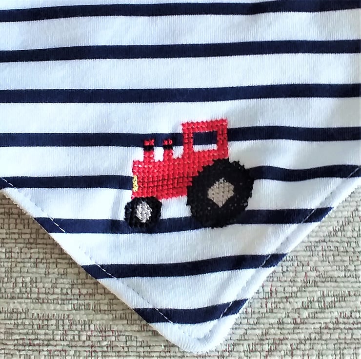 I have hand embroidered a red tractor on the corner of a lovely white bib with navy stripes. The bib has an adjustable press-stud fastening. It is 100% cotton on the front, and the reverse is polyester cotton towelling. It can be machine washed at up to 40C.