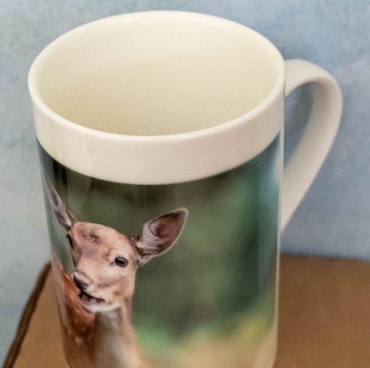 10oz (8.4cm tall) white porcelain mug featuring an original photo of a Fallow Deer which I took on 29th August 2021 in Richmond upon Thames.