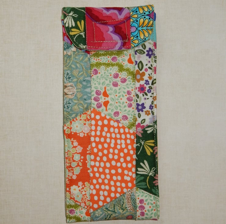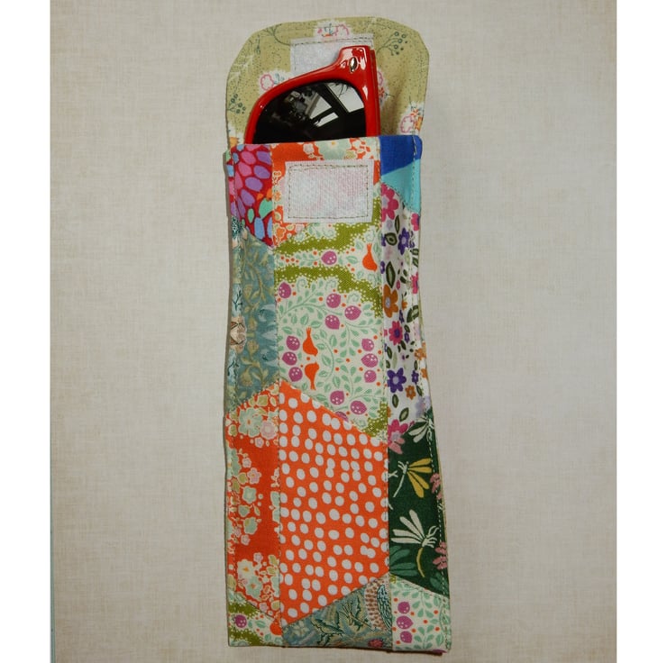 This is a very attractive case for your glasses or sunglasses, which is made from a selection of beautiful modern bright floral and spot fabrics. These fabrics have been patchworked together in half hexagon shapes, and quilted to enhance the effect.