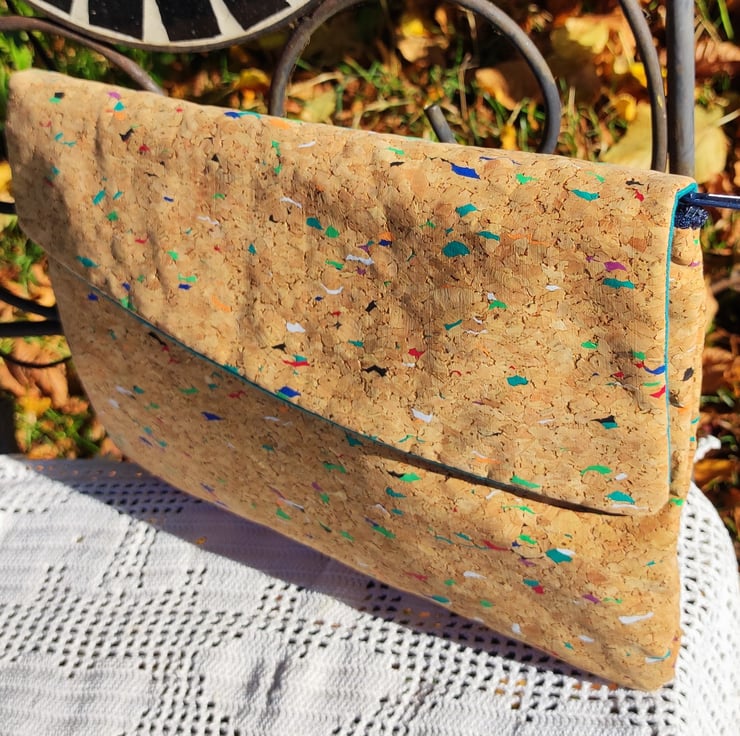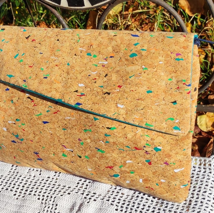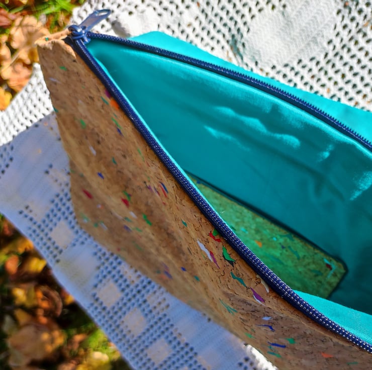 The cork material contains many different colour dots. The lining is a lovely green cotton. Both fabrics complement each other very well.