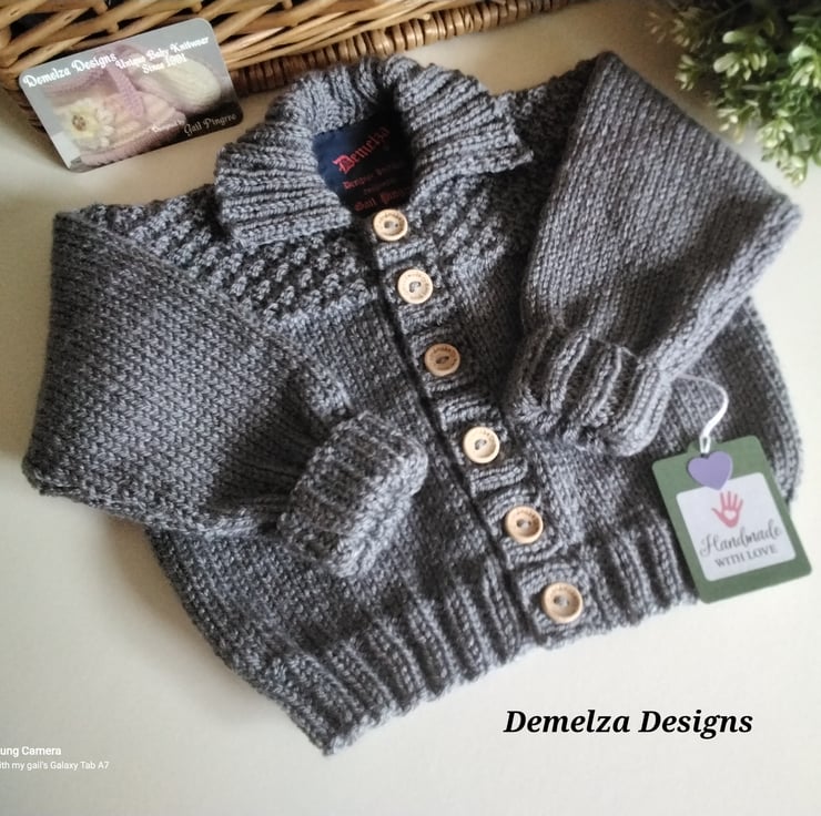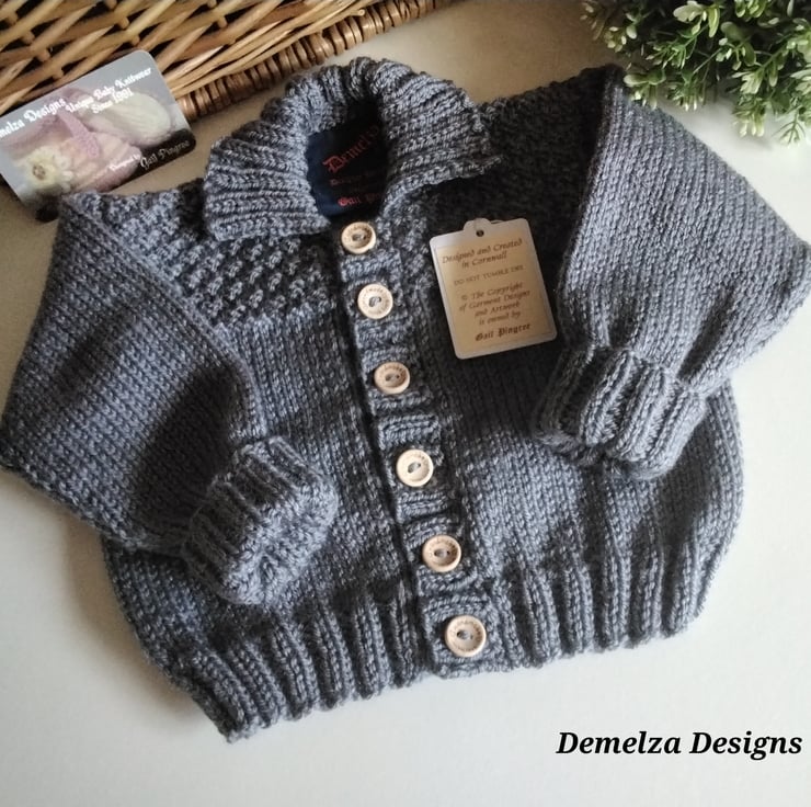 A lovely practical baby cardigan designed and hand crafted using quality branded premuim acrylic soft yarn. The yarn is machine washable at low temperature settings. The buttons are made from genuine wood with a sweet sentiment burnt etched on them. The branded Demelza garment label is attached to the back neck edge with the care instructions woven within it on the reverse side. The garment swing tag is attached to the front as proof of it's origins providing a professional finish one would expect from a quality hand crafted British product.