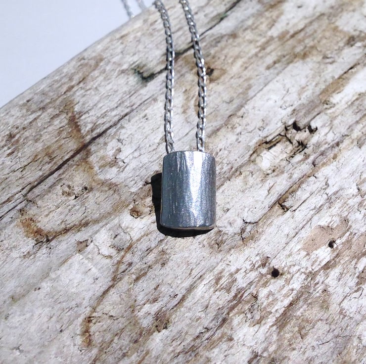 I have handcrafted this small pendant from 8 x 2 mm D shaped sterling silver. I have given it an attractive hammer textured finish and I've soldered half a sterling silver jump ring to the back and hung it from an 18 inch sterling silver chain necklace.