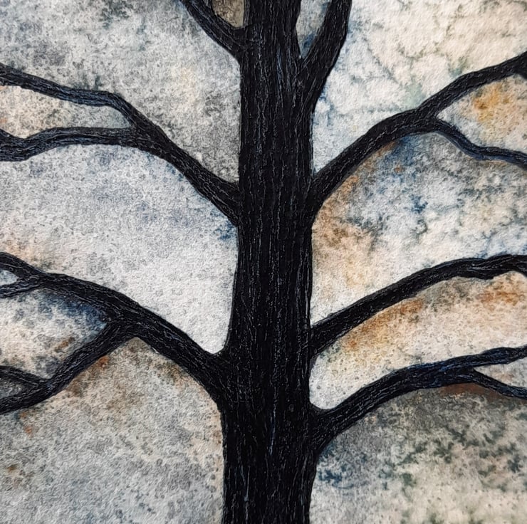 The painting was triggered by the horrors of the war in Ukraine. The dead victims bear silent witness to the atrocities and war crimes. The tree is symbolic of the endurance, strength and courage of the Ukrainian people but also as a witness to the past and present.