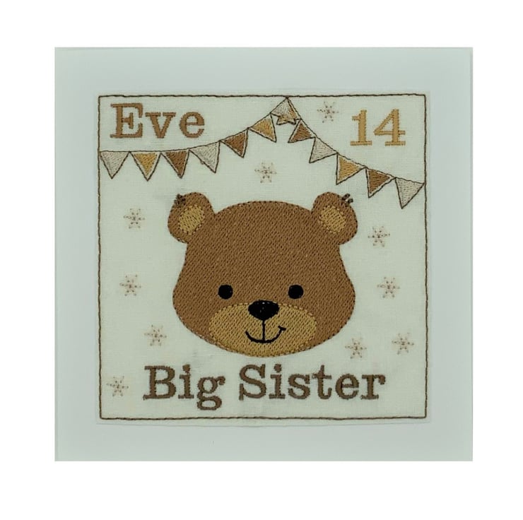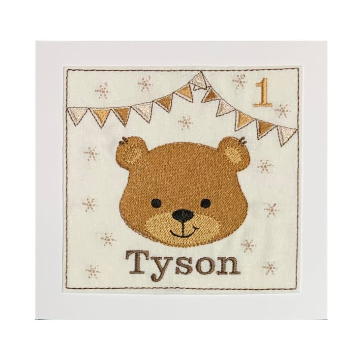 This embroidered teddy bear birthday card is personalised with the age and name of your choice and is embroidered on to a White Linen base.