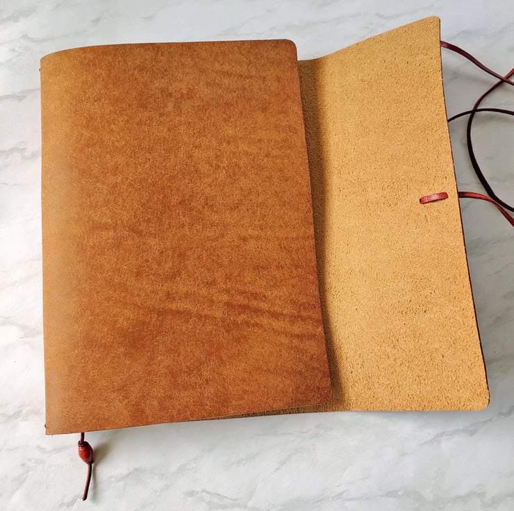 A fine leather strip wraps round the cover and tucks in, to keep the cover closed.