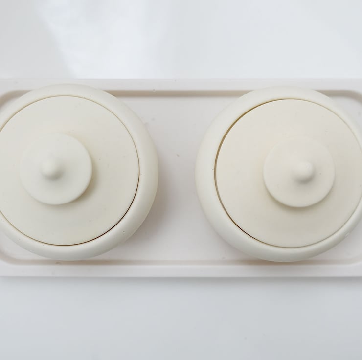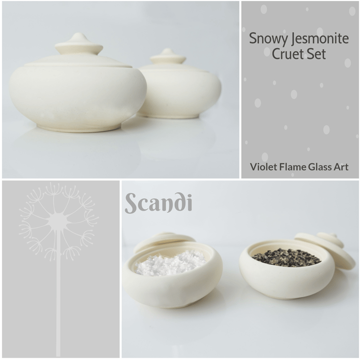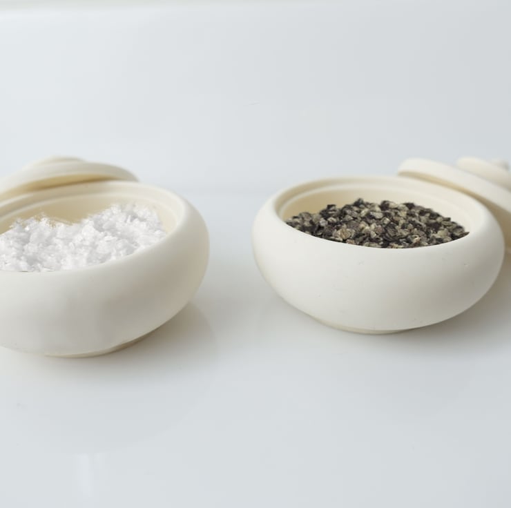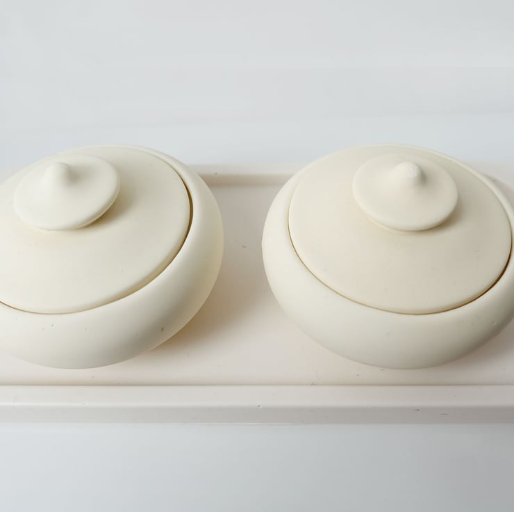 Cruet pinch pots set for salt and pepper with matching oblong tray. The perfect little condiment for your dining table and dinner parties.. Made from cream coloured jesmonite sealed with a food safe and heat proof sealant.