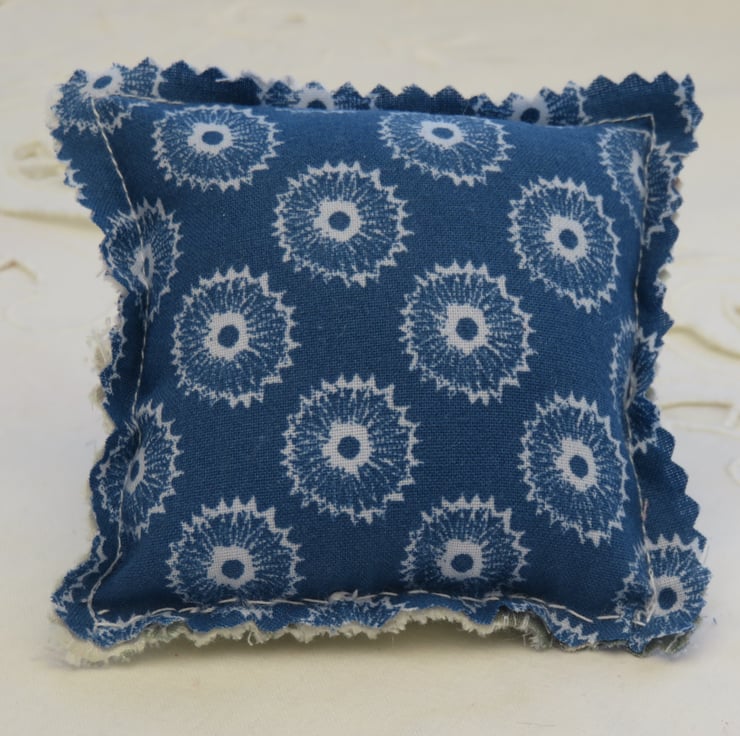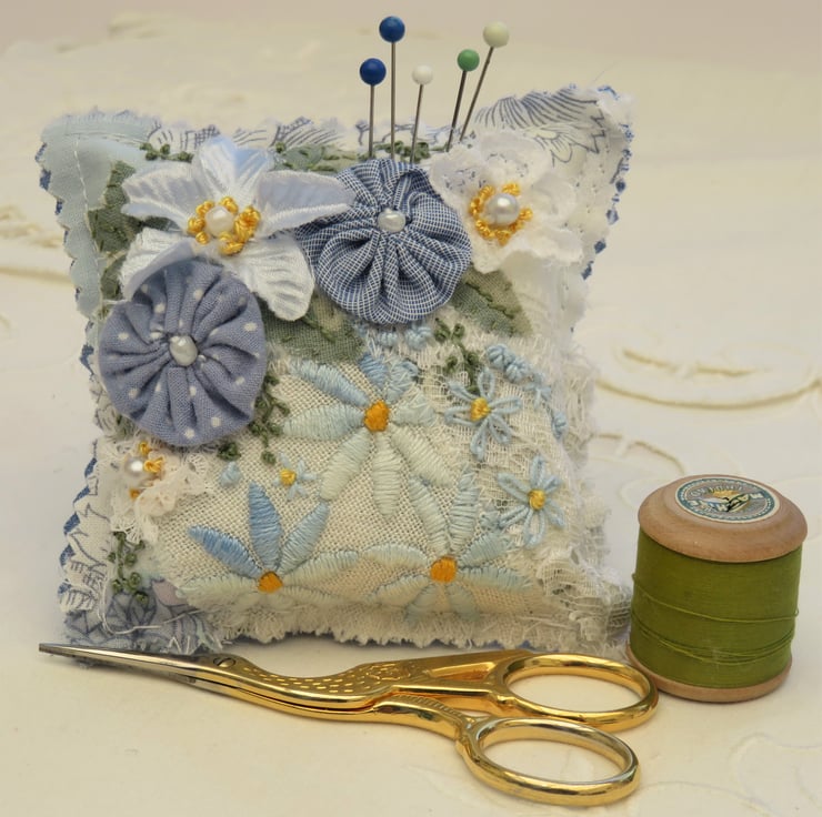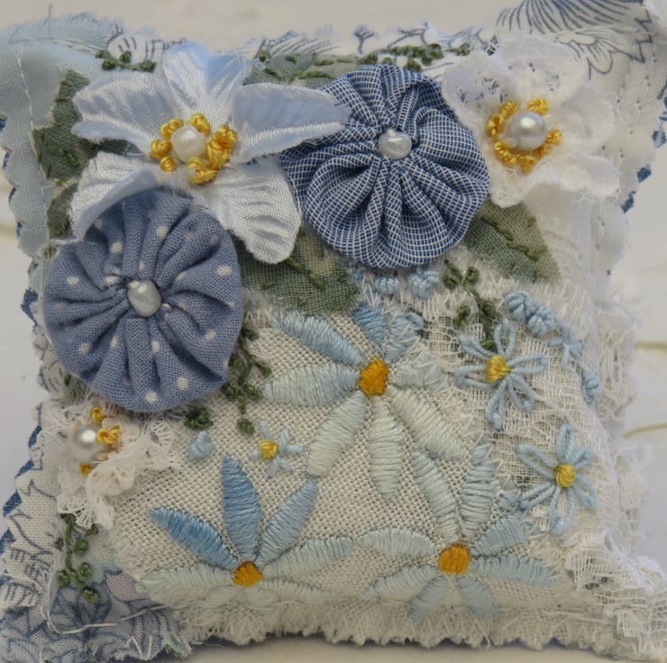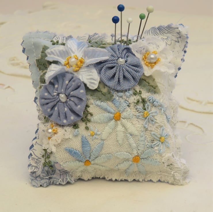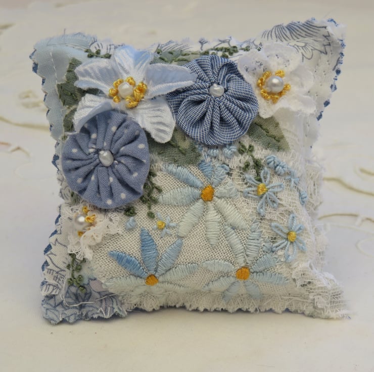 A pretty pincushion, in a classic blue and white colour combination, featuring a posy of flowers, consisting of two suffolk puffs two lace ruffles, and a flower from a 'silk flower' spray, with beads, appliqued details and hand embroidery on a patchwork background.