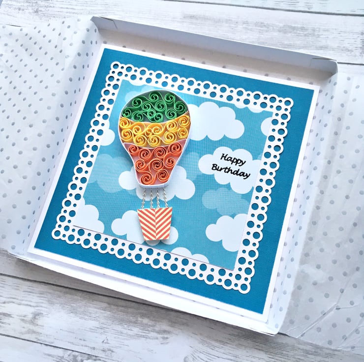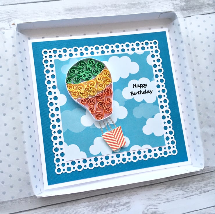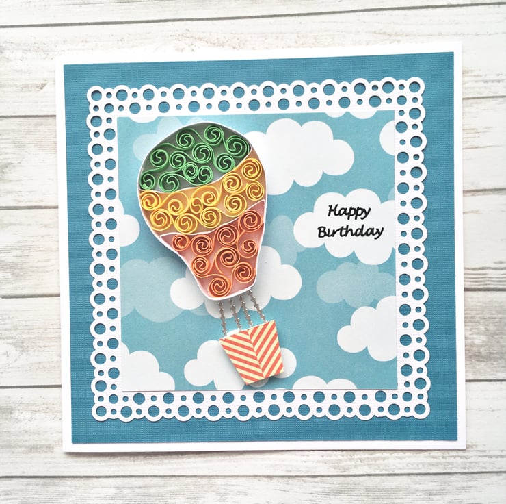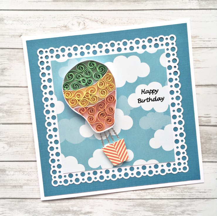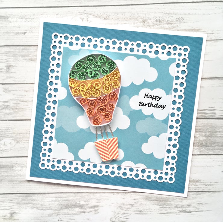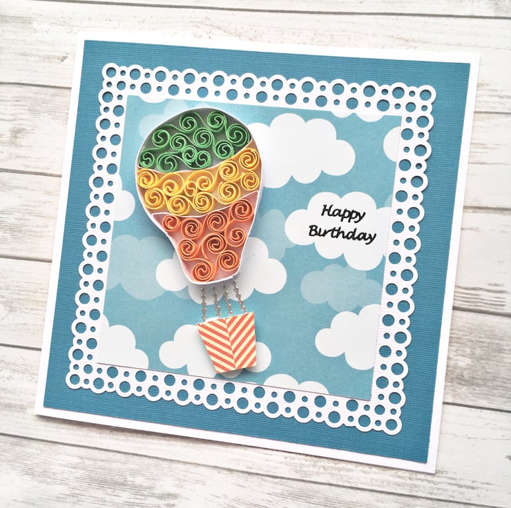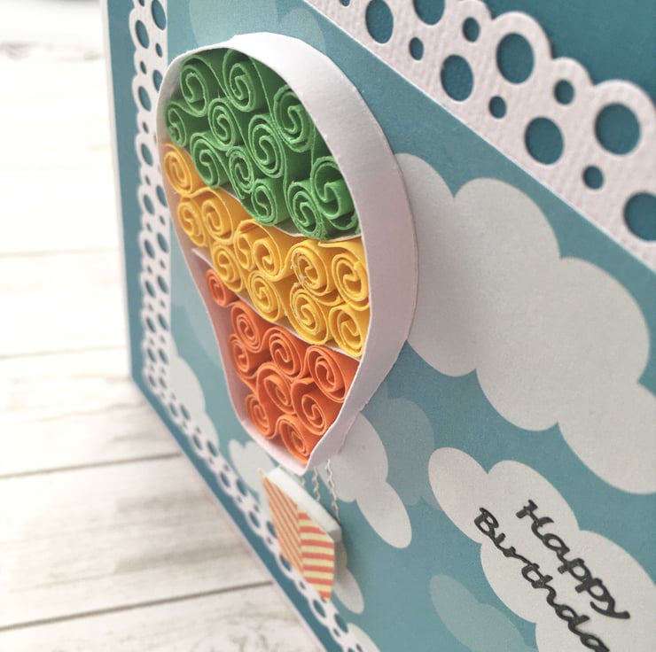 This handmade birthday card features a fun, colourful quilled design of a hot-air balloon in a cloud-filled sky.
