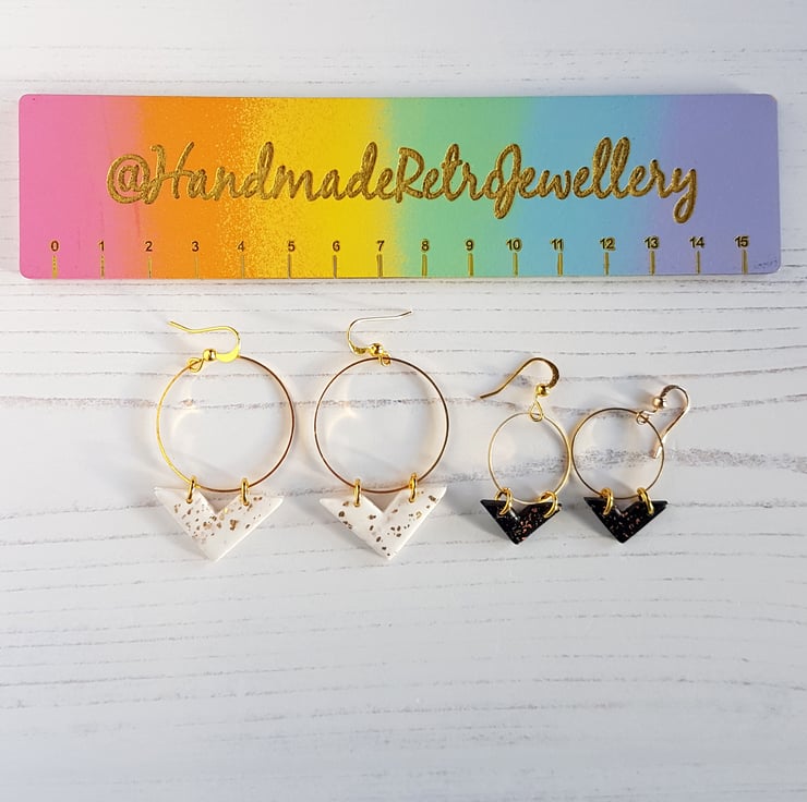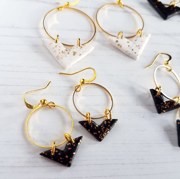 Made from polymer clay, the V shapes are fixed onto a gold plated hoop, which is then attached to a gold plated fish hook style fixing for a drop effect