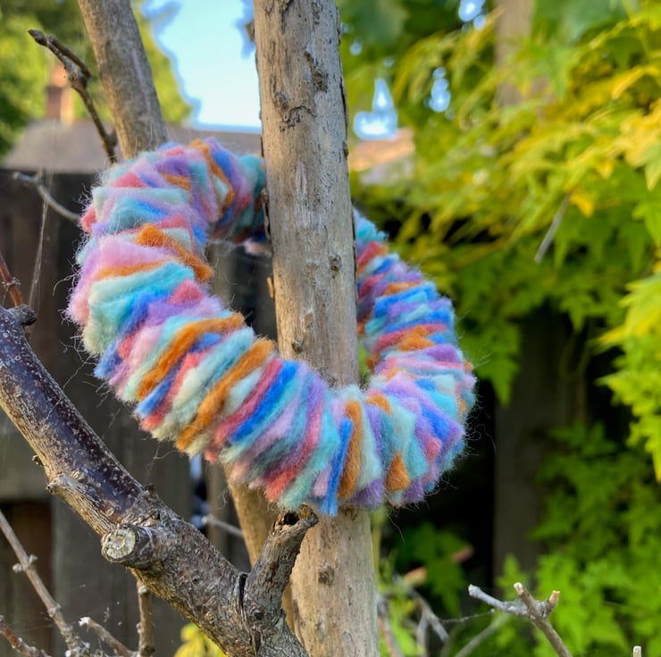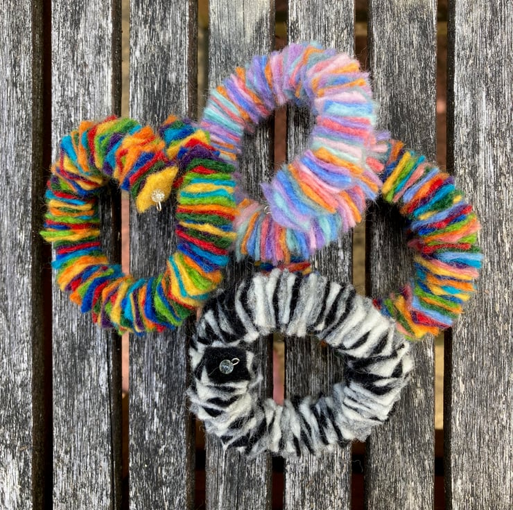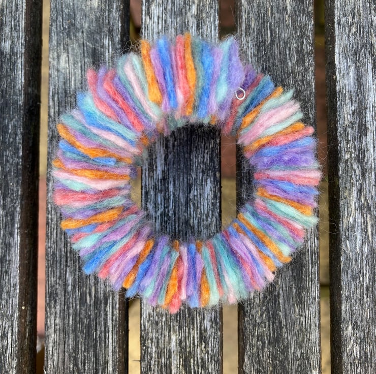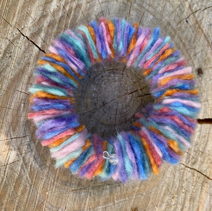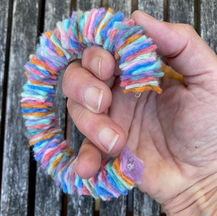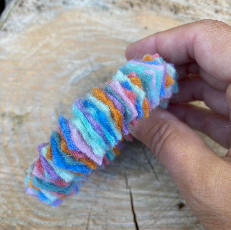 A fun modern felt bracelet perfect for daily wear. This pretty bracelet is a delight to wear, soft and lightweight you will almost forget its there. The bracelet has been made using a memory wire base onto which small (1.5cm) squares of handmade merino wool felt, in a variety of pastel colours, has been threaded. Small clear beads have been added at each end and the wire ends turned into a small loop to secure the felt and prevent the presence of sharp edges. The bracelet has been made to fit a wrist of approximately 7.5" but due to its construction will accommodate slightly smaller or larger wrists. This bracelet could easily be worn stacked with others.
