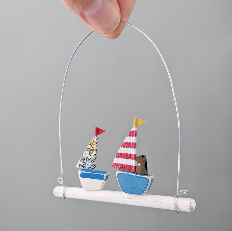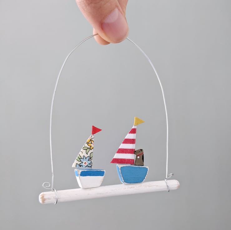 Salty the sea dog is going sailing in his new boat! A gorgeous colourful nautical decoration to hang up in your home.
