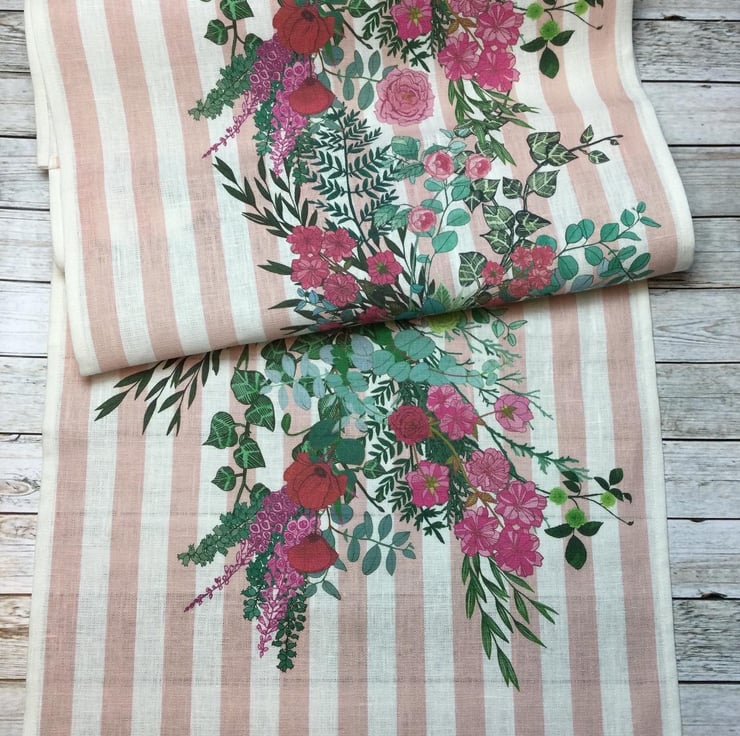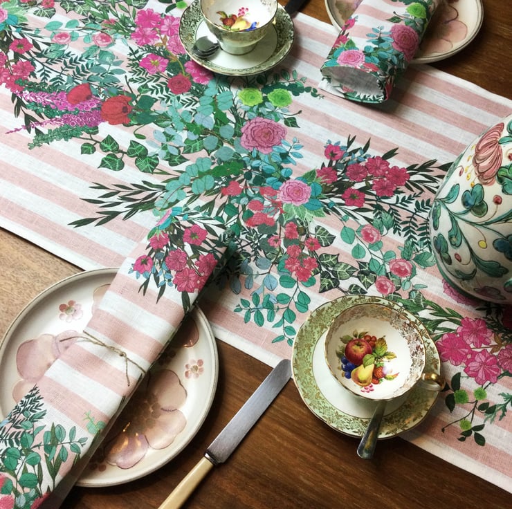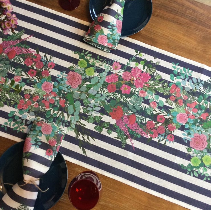 The hand drawn design, Flowers & Stripes, features Scottish thistles, curly doddies, heather, eucalyptus, ferns, ivy, foxgloves, cherry blossom and roses. This colourful table runner is perfect for every day casual use and for special occasions.