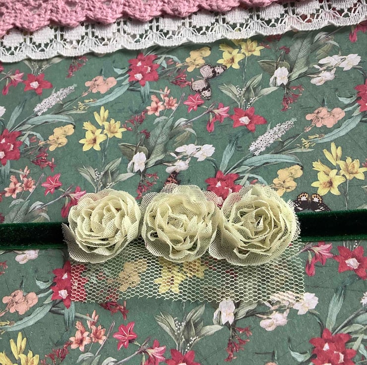 Across the centre lies a narrow green velvet ribbon with 3 pretty pale lemon flowers.
