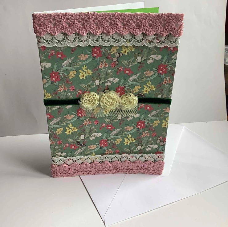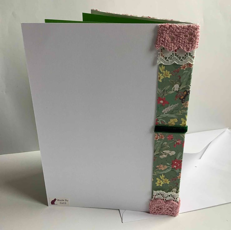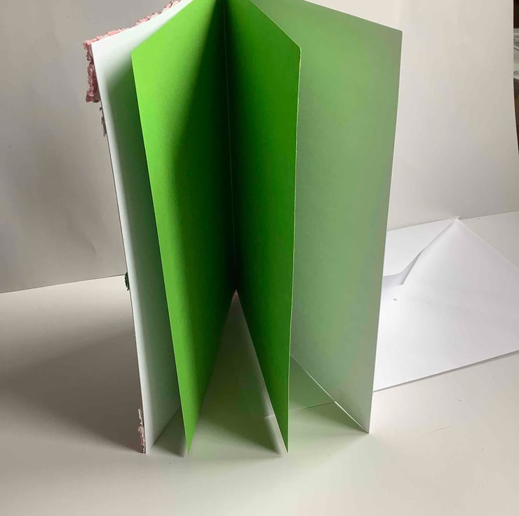 This is a handmade, original card which is blank for your own message. The card and envelope are white and the insert is green.