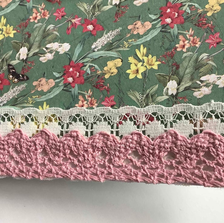 Across the top and bottom lies a layer of cream lace and pink lace effect braid