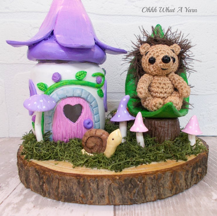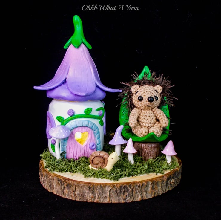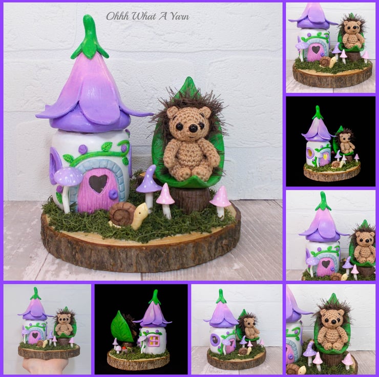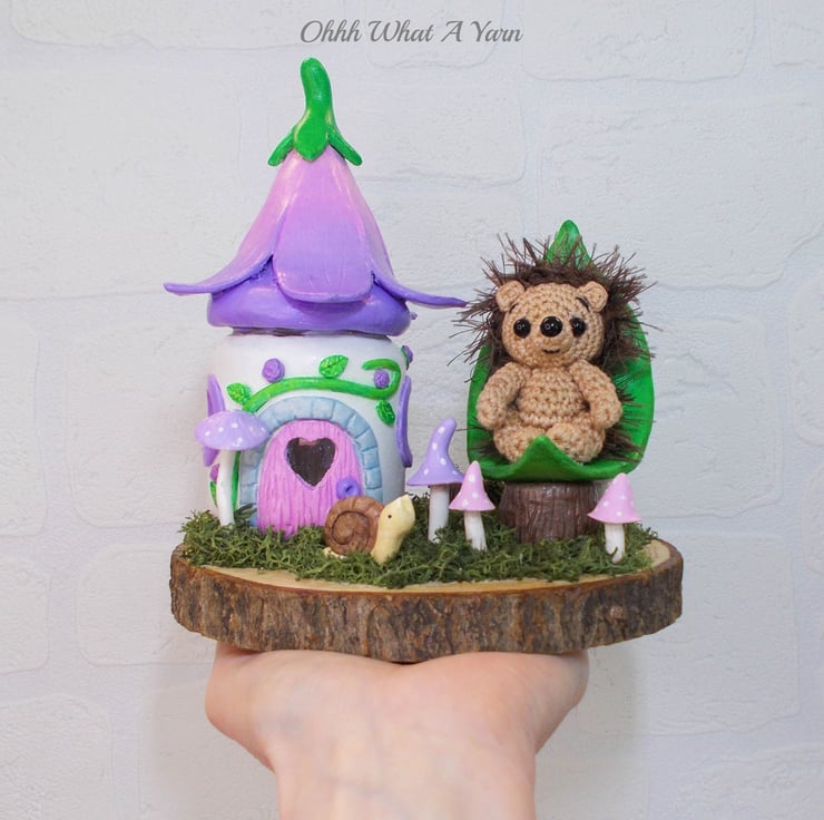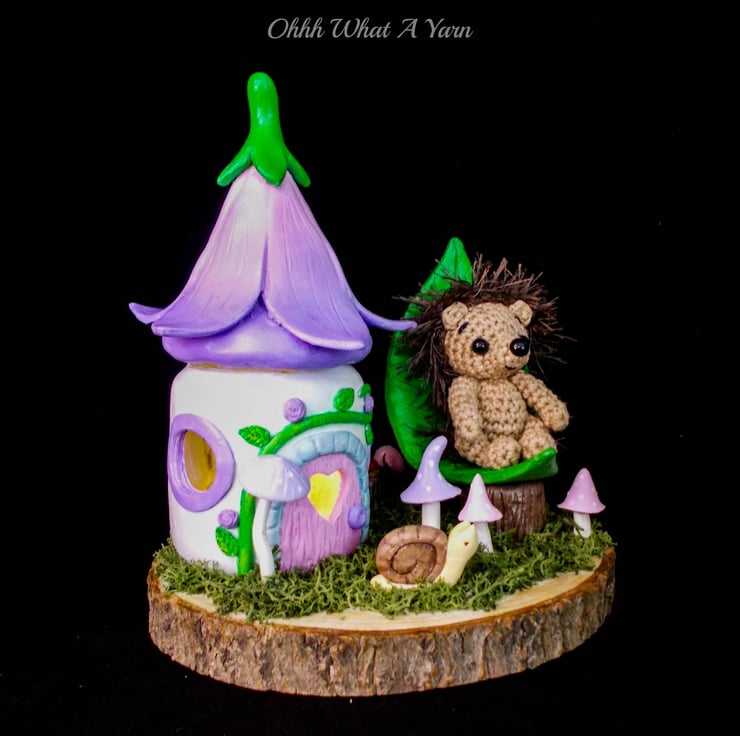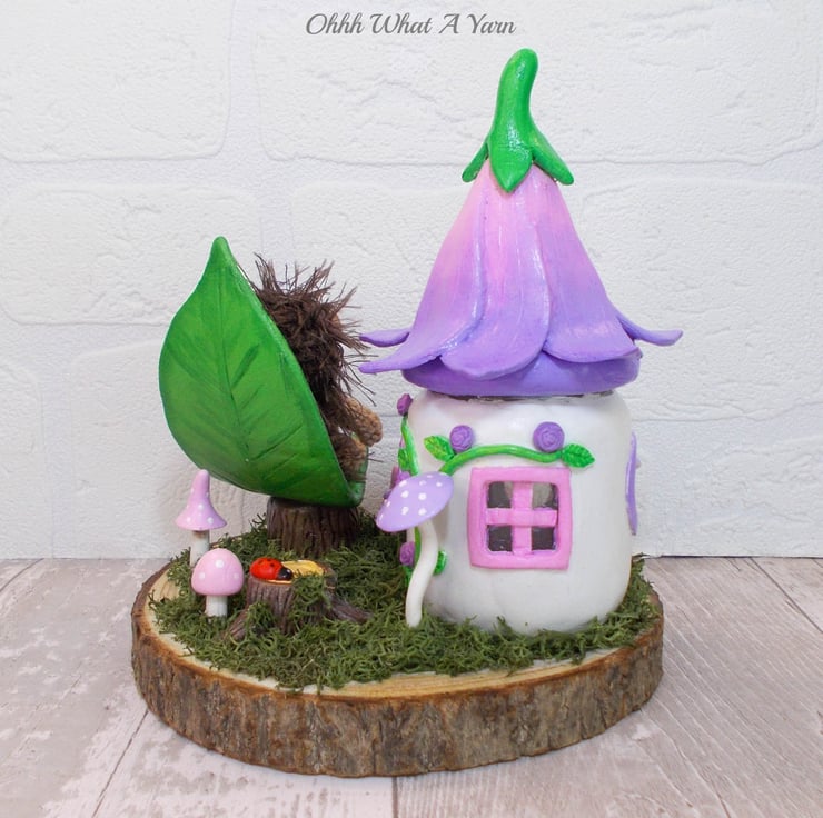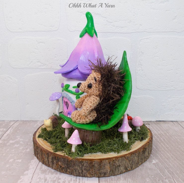 This one of a kind mixed media sculpture features a mini hedgehog sat in her leaf shaped chair in the garden of her fairy friends.