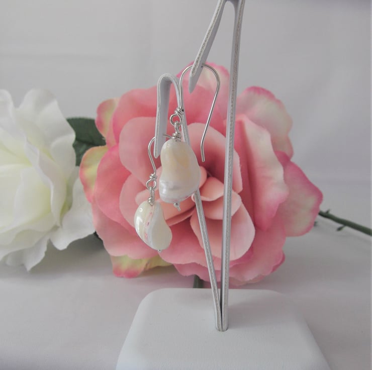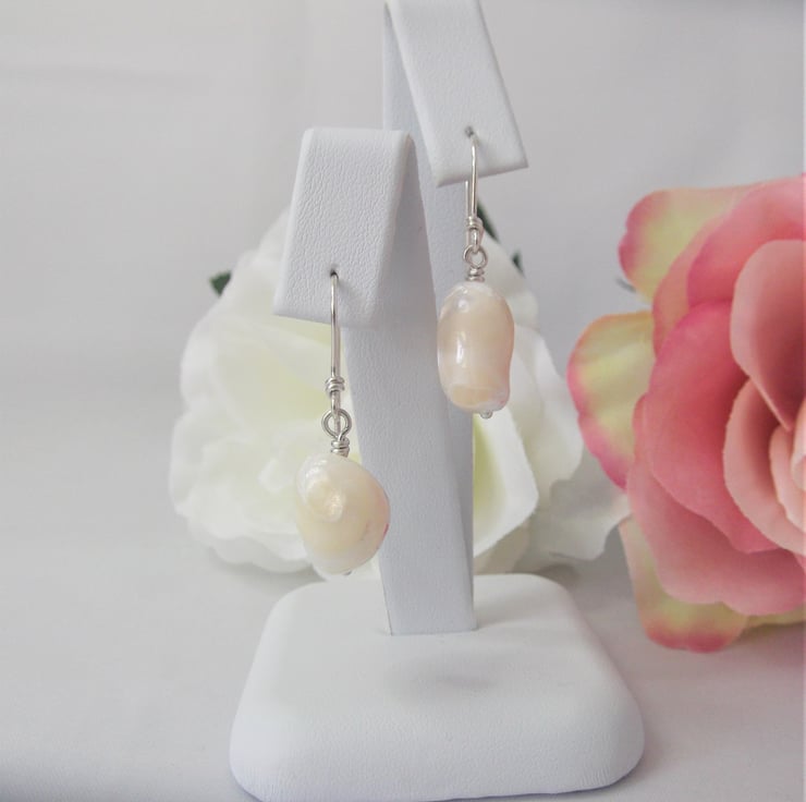 These dangle earrings have been made using Mother of Pearl nuggets and sterling silver wire.