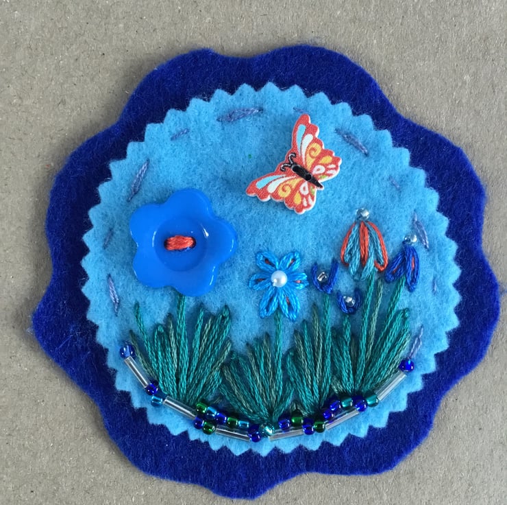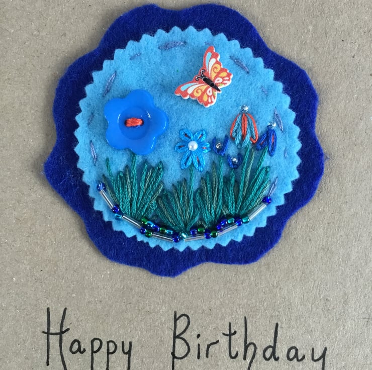 This Hand Embroidered Butterfly Birthday Card has a circular embroidery of a garden of blue flowers with an orange and yellow butterfly button fluttering over them. A blue flower button stitched with orange embroidery thread, starts the row of flowers which are hand embroidered in blue and orange threads in Lazy-Daisy and Fly Stitches with stems and leaves in green Long and Short Stitches. These flowers stand in a border of silver, blue and green glass beads.