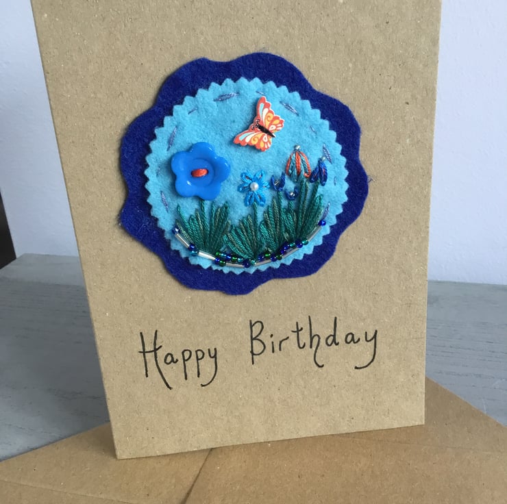 The message ‘Happy Birthday’ is hand written in black ink below the embroidery. The card is left blank inside for you to continue your personalised birthday message. The card is of matt light brown card, 5 x 7 inches in size, with a matching envelope.