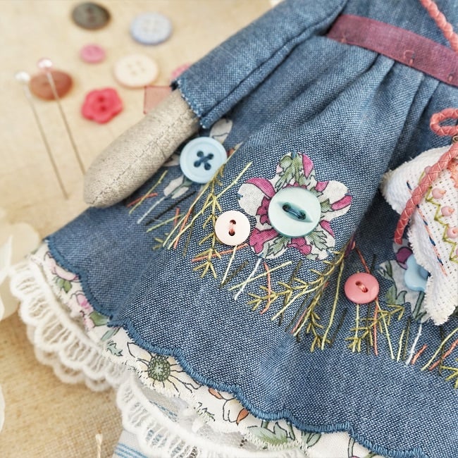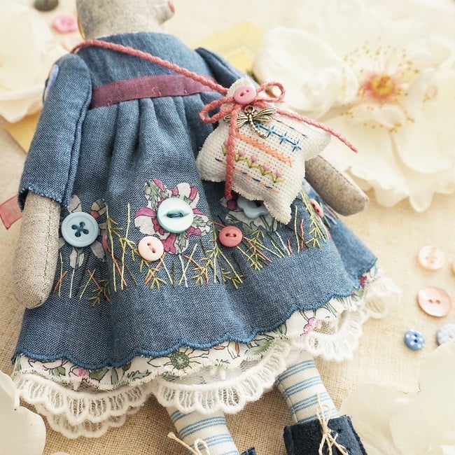 Nepte's dress is a hand applique and embroidered fine chambray, recycled from my daughter's shirt. It is teamed with a tiny piece of Liberty fabric both with the applique flowers and with the underskirt. I am trying to use tiny pieces of fabric in a creative way, repurposing rather that throwing away. She was a joy to make and I love the denim look xx