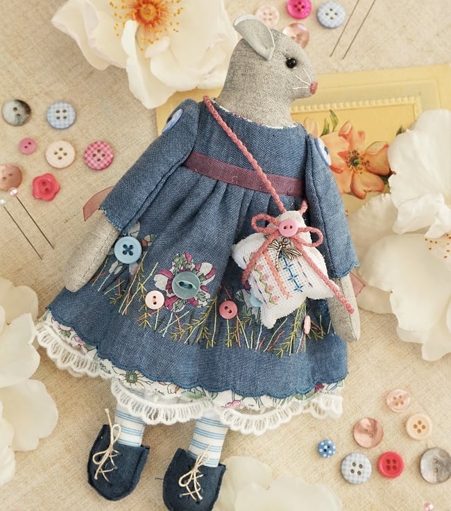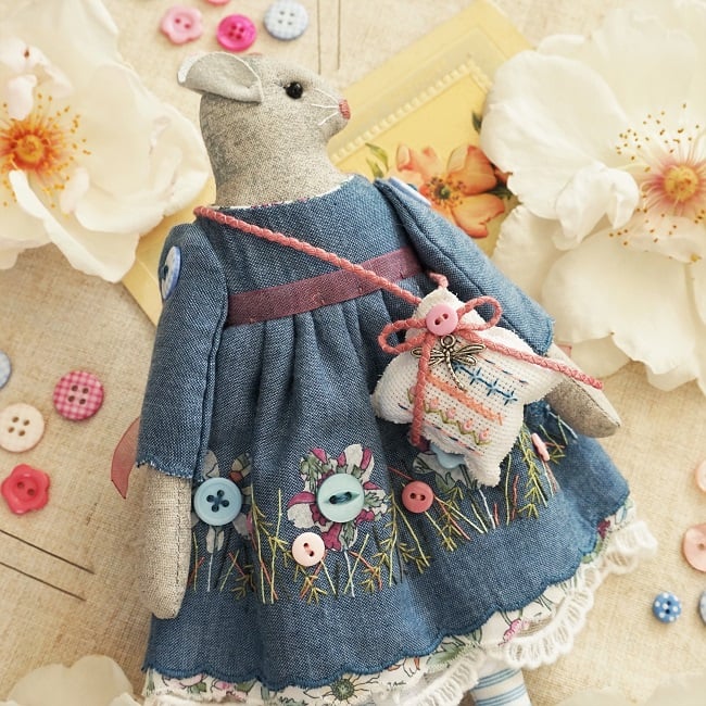 This is Nepte, a tiny grey mouse. She is a hand embroidered mouse with little leather ears and tail. She is dressed in a an applique and embroidered dress with a meadow feel She has coordinating underskirts and cotton lace bloomers. Her dress is finished with organza ribbon, tiny buttons and little leather shoes.
