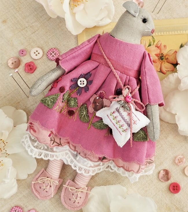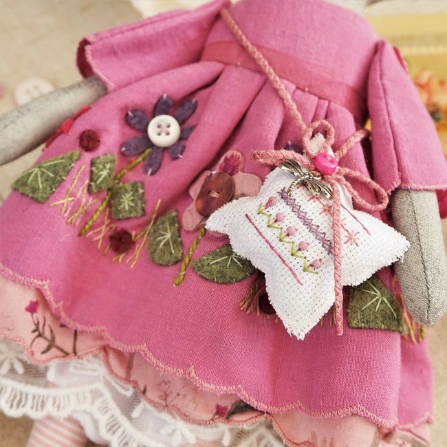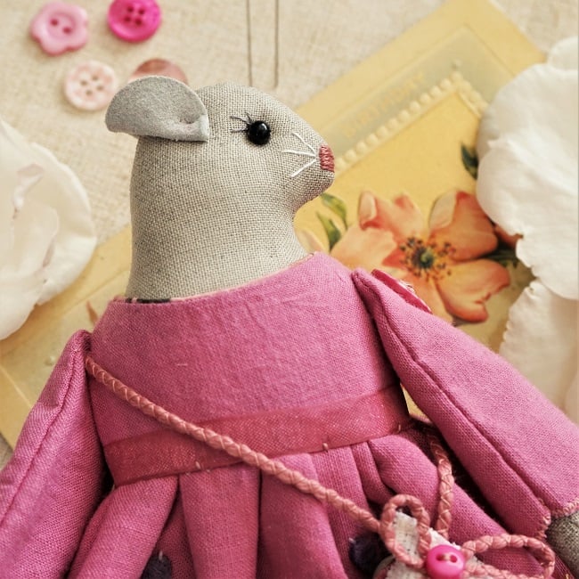 This is Daeseg, a tiny grey mouse. She is a hand embroidered mouse with little leather ears and tail. She is dressed in a an applique and embroidered dress with a meadow feel She has coordinating underskirts and cotton lace bloomers. Her dress is finished with organza ribbon, tiny buttons and little leather shoes.