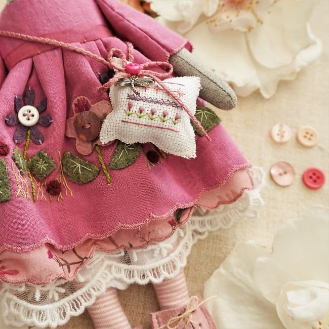 She is softly stuffed with rose petals in her stuffing for a gentle scent and she has a tiny rose quartz crystal at her heart for love. She has a brass ring to her back in case you want to place her on the wall.