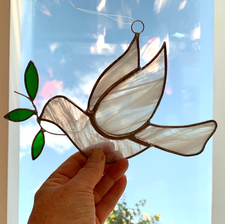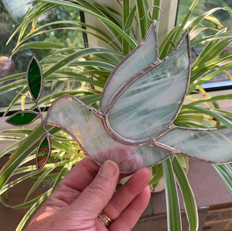 This peace dove has been made from streaky white and clear sea and water glass with green glass for the leaves.