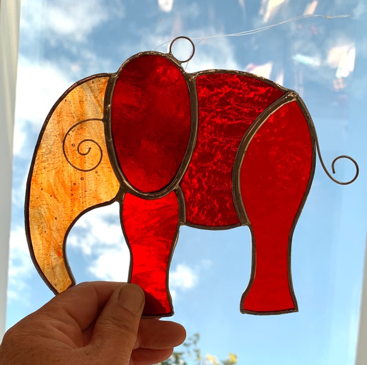 This elephants measure 14.5 cms x 13 cms and has been made from a selection of 5 different types of red stained glass. The glass has some really interesting textures.