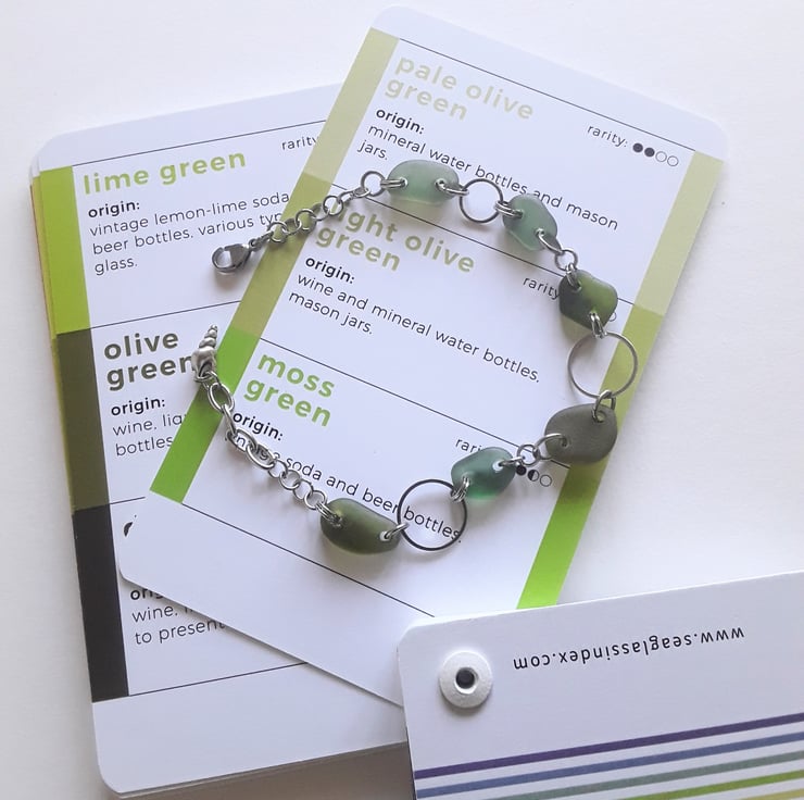 6 pieces of seaglass I found on the Durham coastline, in various olive and moss greens, have been hand-drilled to create this fabulous seaglass linked bracelet.