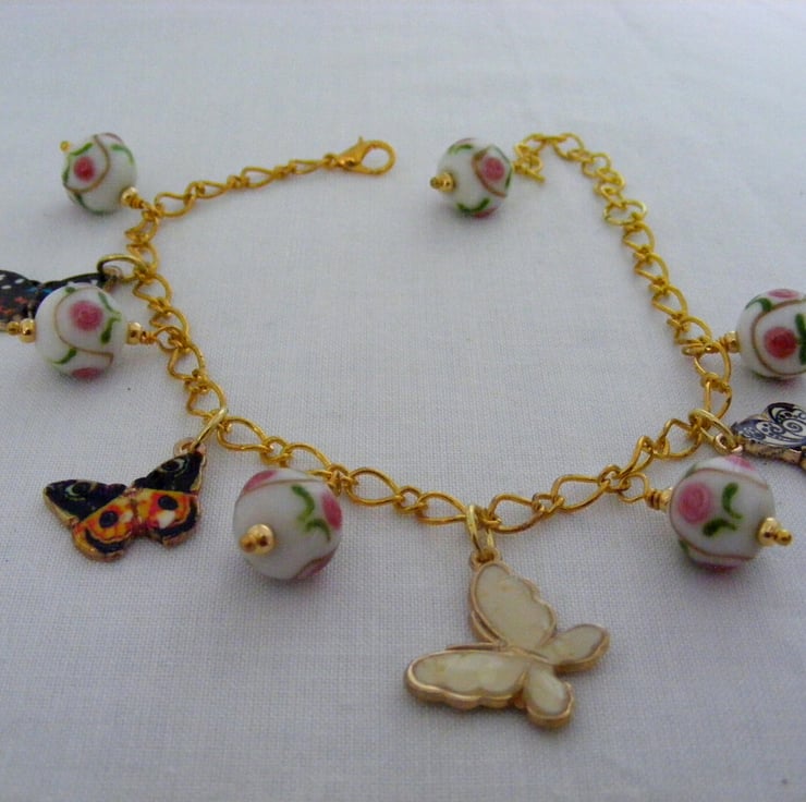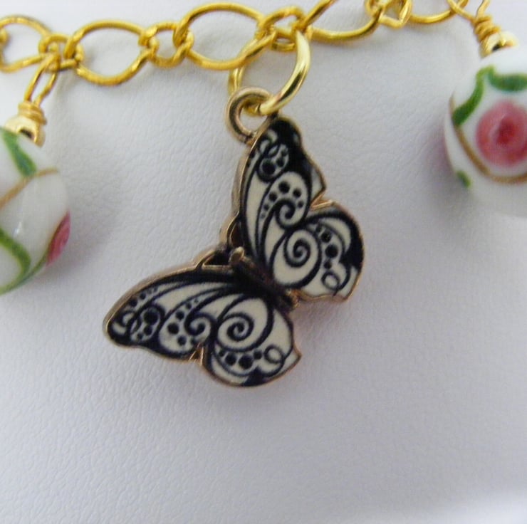 18 x 21mm mother of pearl butterfly charm, 20 x 11mm gold plated and enamel butterfly charms, 3mm gold plated spacers, gold plated headpins, chain, lobster clasp and extension chain.