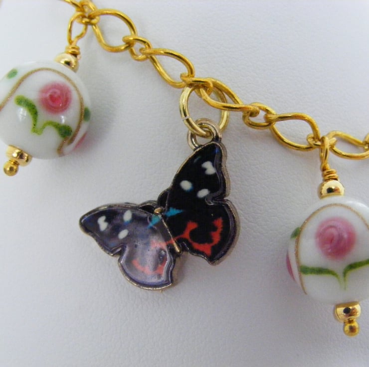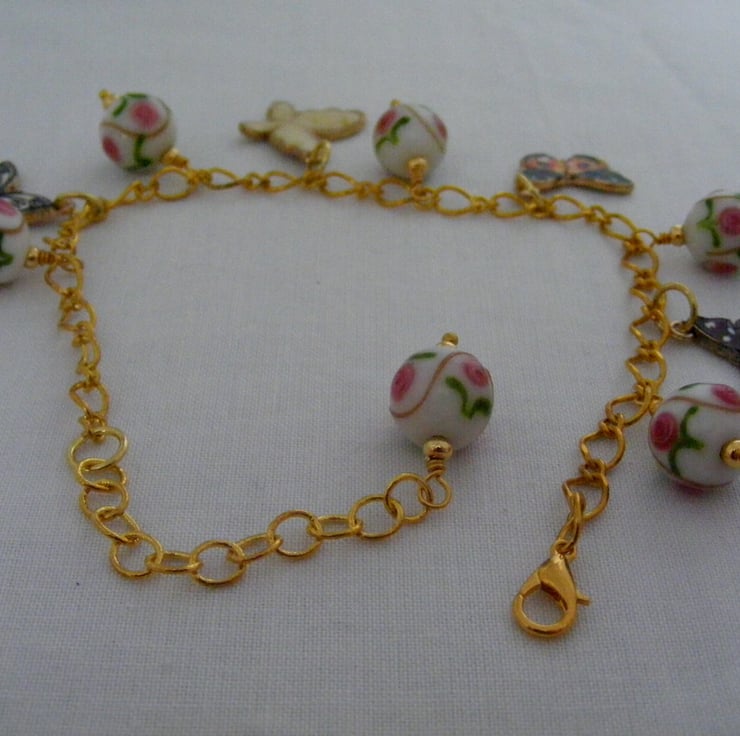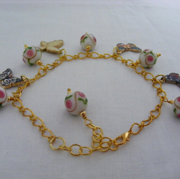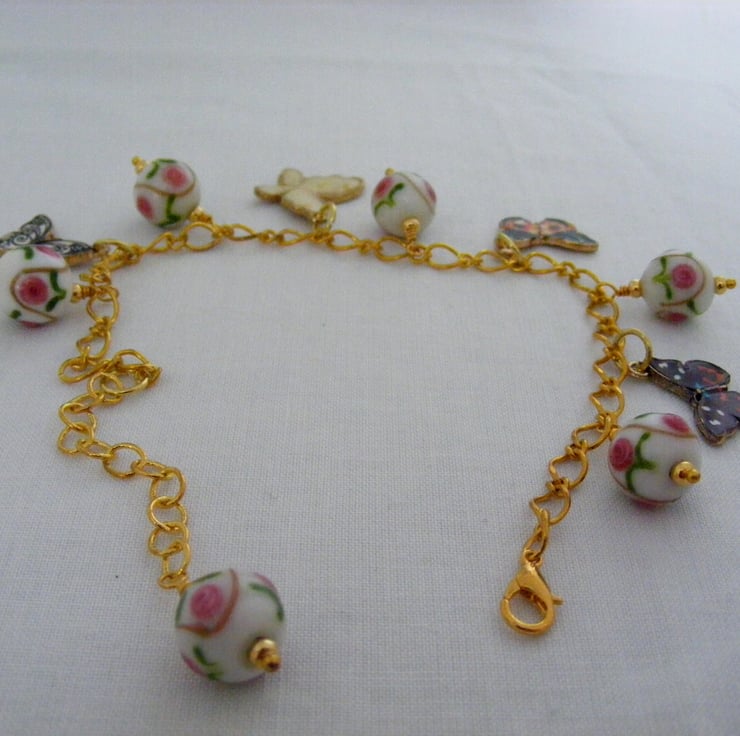 Anklet is handmade with, 12mm white with red roses ceramic round beads,