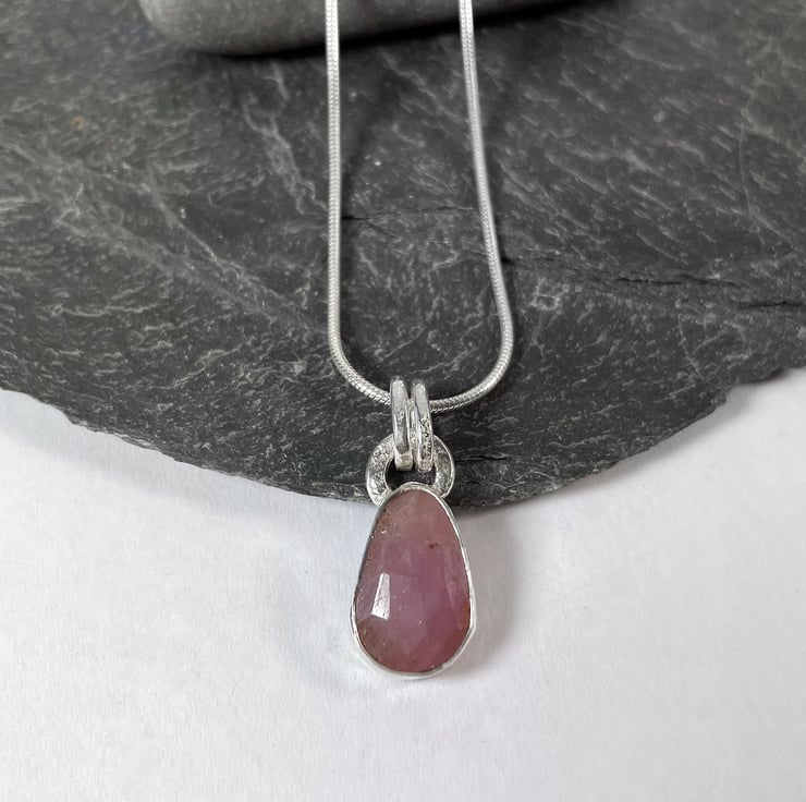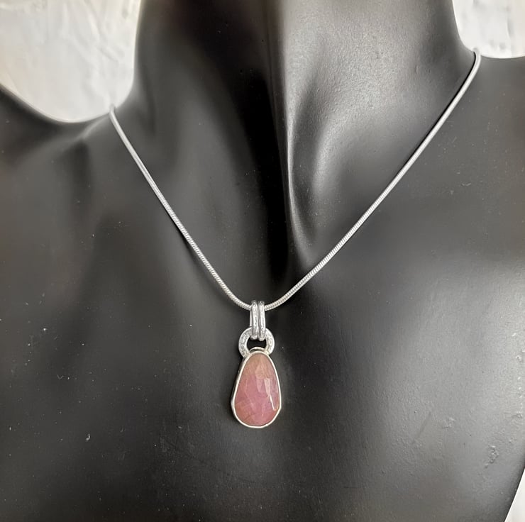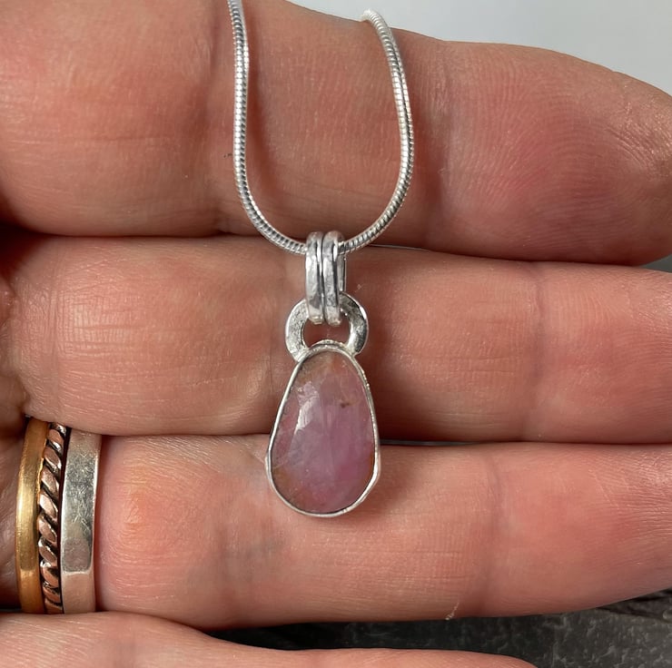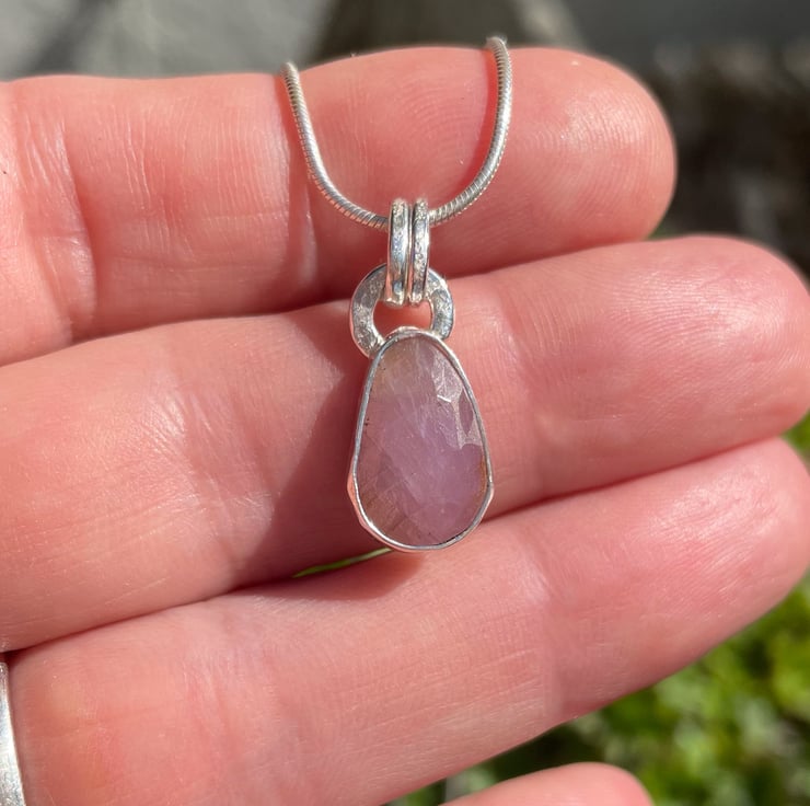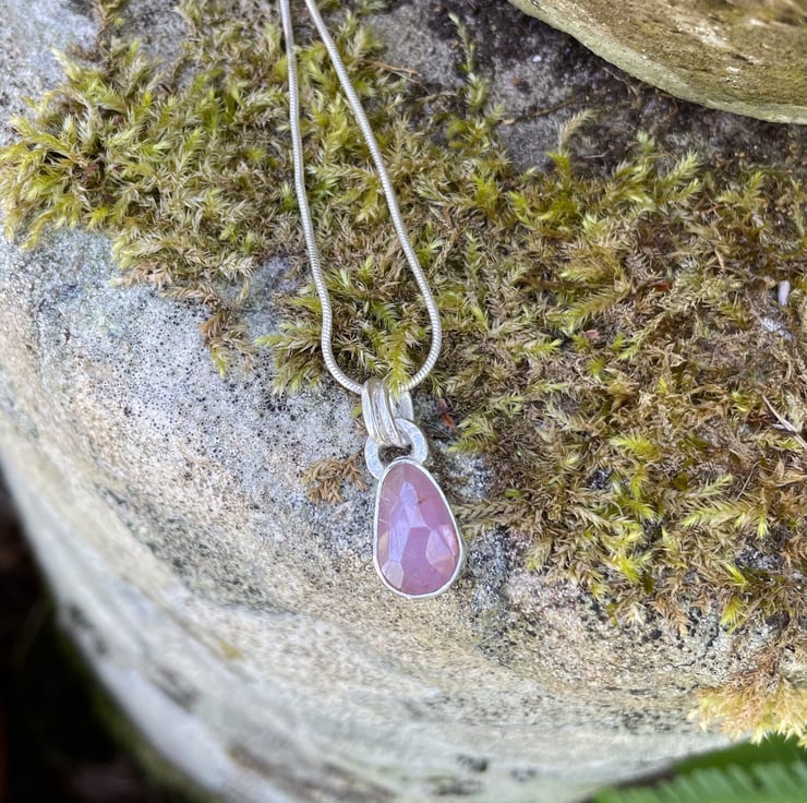 A pretty pale dusky pink freeform rose cut sapphire has been simply set in silver. The sapphire looks different colours in different light. It has a shimmer, and the facets catch the light. See pictures of it in both daylight and artificial light.
