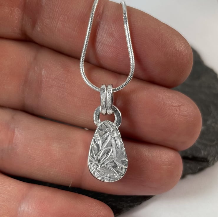 I have added a robust, textured bail to balance the piece. The back of the pendant has a hand stamped stylised floral pattern.