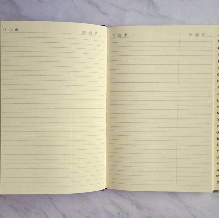 Inside is a simple address book, with lettered tabs. The sheets have lines and a vertical divider 1/3 of the way across, with little icon pictures for address, phone number etc.