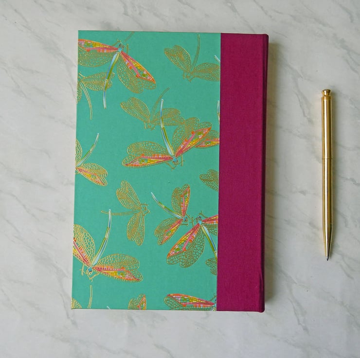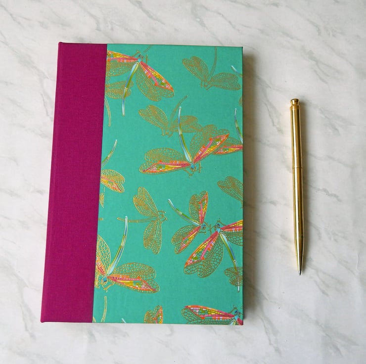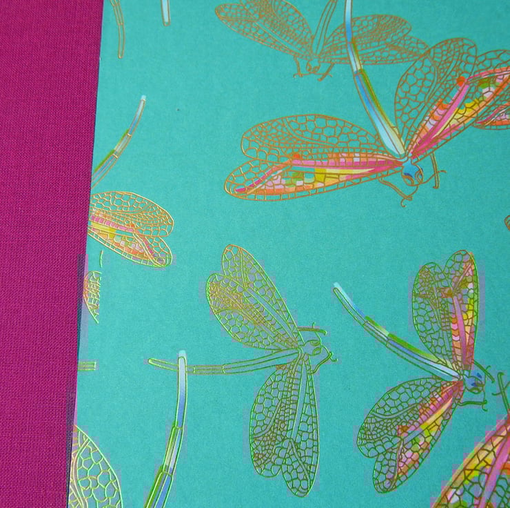 A traditional hard cover case binding, with a lovely design of golden dragonflies on a turquoise background.