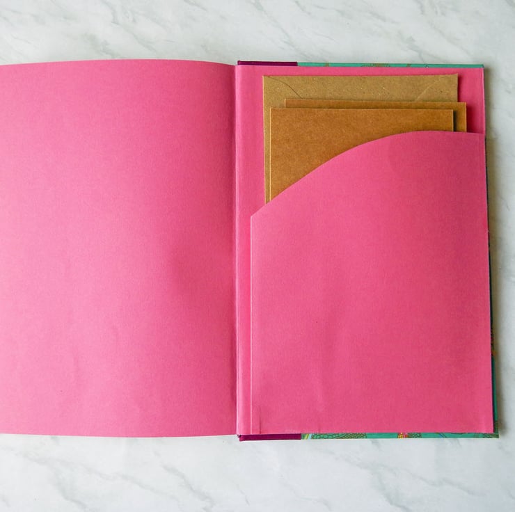There is a matching pocket inside the back cover, with bellows sides to allow for expansion.