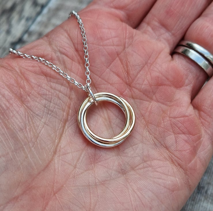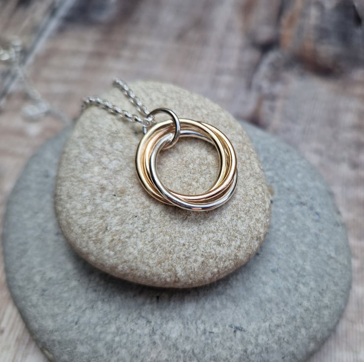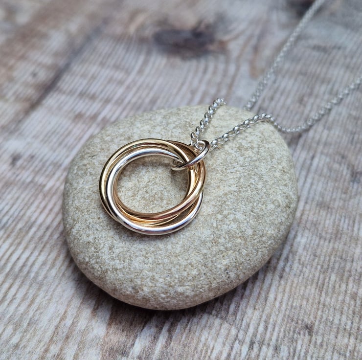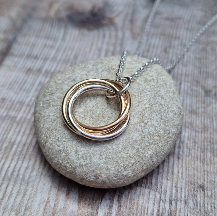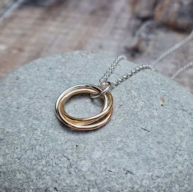 This handmade Russian ring necklace features three interlocking circles, each crafted from recycled sterling silver and recycled 9ct yellow and red gold. The movement of the rings creates a beautifully fluid design, making this piece a timeless symbol of connection and unity.