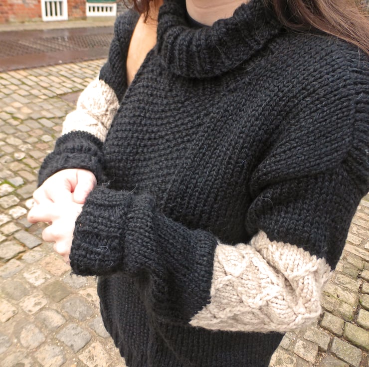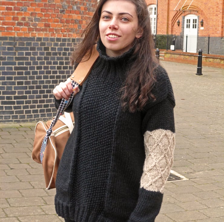 The sweater has ribbed welts, cuffs and turtleneck, a moss stitch (seed stitch) panel on the front and back and a feature diamond pattern on the sleeves.