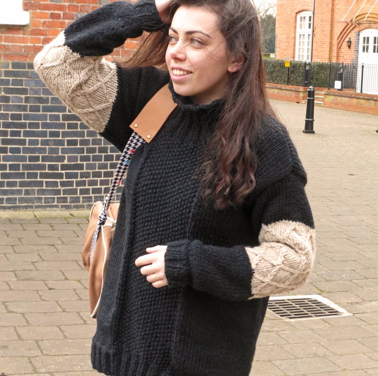 This is a knitting pattern written in English to make a warm, chunky sweater designed to accommodate several layers as well as a coat on top! It is great for travelling and smart enough to keep on if the workplace is a little chilly!