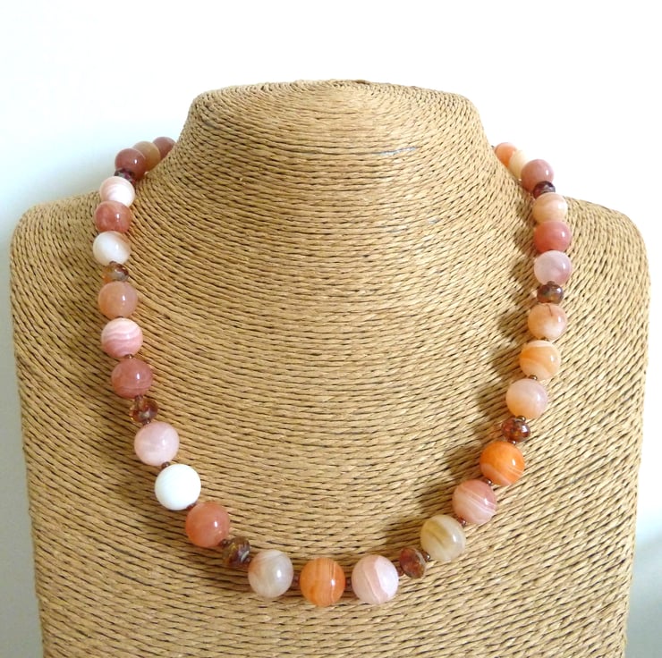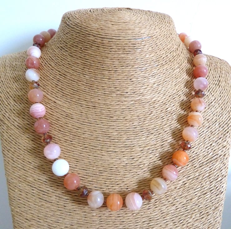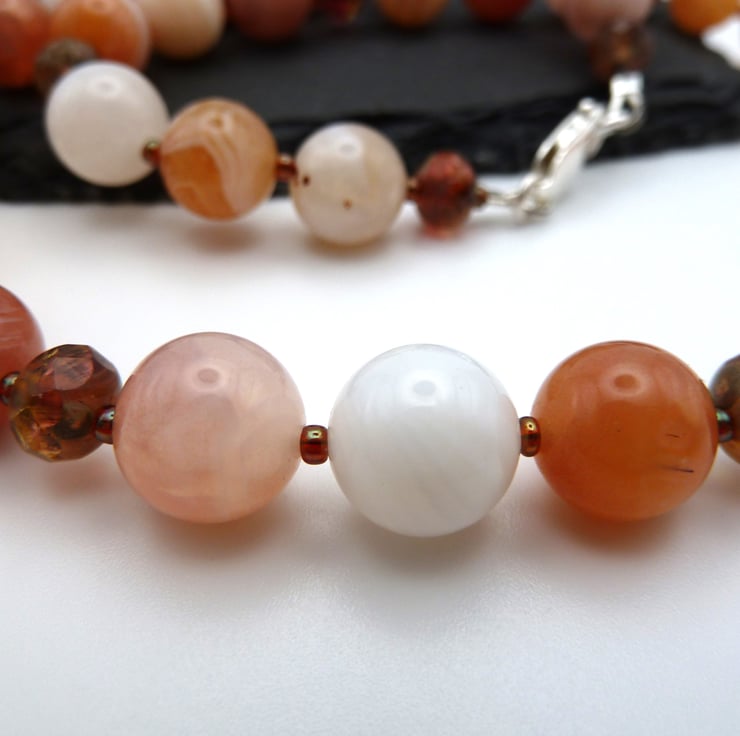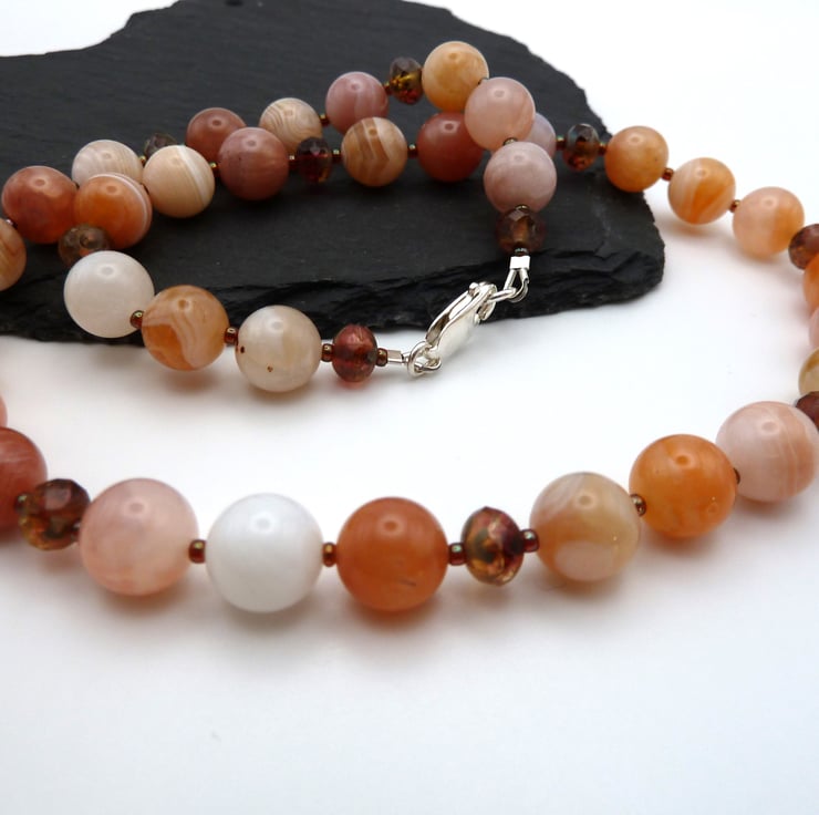 A necklace made with Botswana orange agate gemstone beads and Czech glass beads. The necklace fastens with a sterling silver lobster clasp.